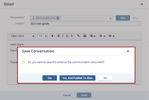 - Click the appropriate option – Yes, Yes, And Publish to Investigative Sites, No displayed in the Save Conversation popup window.