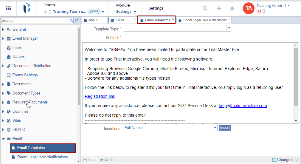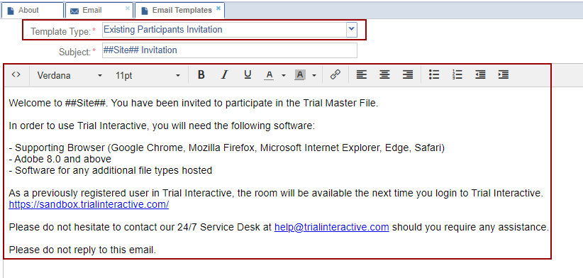 - Once the user selects the ‘Template Type’ the message associated with the particular template will be displayed below it in the email format.