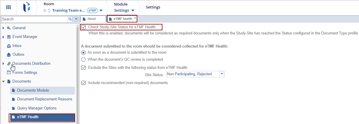 - Administrators can configure whether recommended (non-required) documents are included in the calculation of the room’s eTMF health.