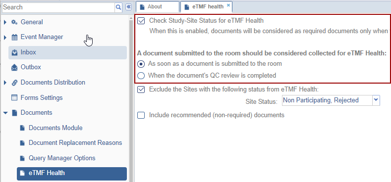 - The ‘Check Study-Site Status for eTMF Health’ option can be enabled or disabled here. When enabled, documents will be considered as required documents only when the Study Site has reached the Status configured in the Document Type profile.