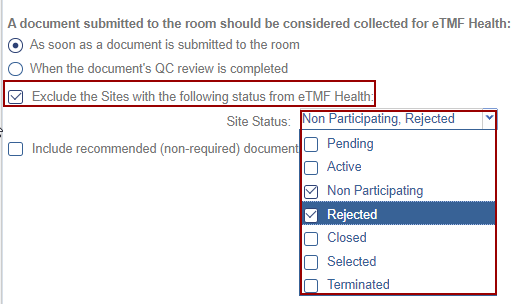 - The option ‘Exclude the sites with the following status from the eTMF completeness tracking’ ensures that document requirements for sites with the selected status are excluded from the room’s eTMF health calculations.
