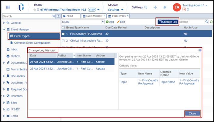 The Change Log option provides a detailed record of event types added or modified by the user. It consists of two sections: