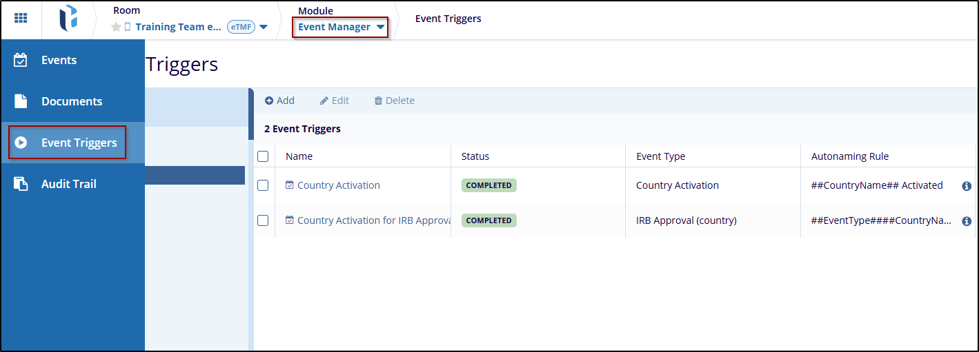 An Event Trigger display folder that carried statuses of each event at the study, country, and site levels.