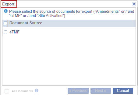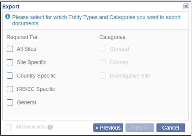 - Select the ‘All Required Documents’ option to export documents from all document source categories.