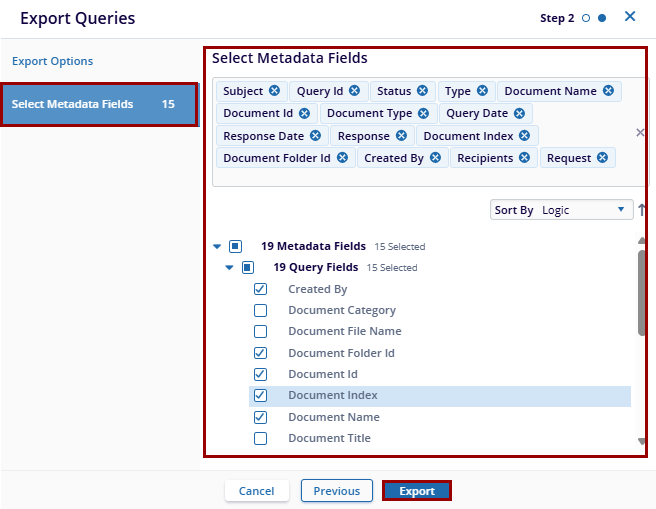 - Once proceed to the Select Metadata Fields option and select the metadata fields that are required, the user can sort it by Alphabet or Logic to include in the export.