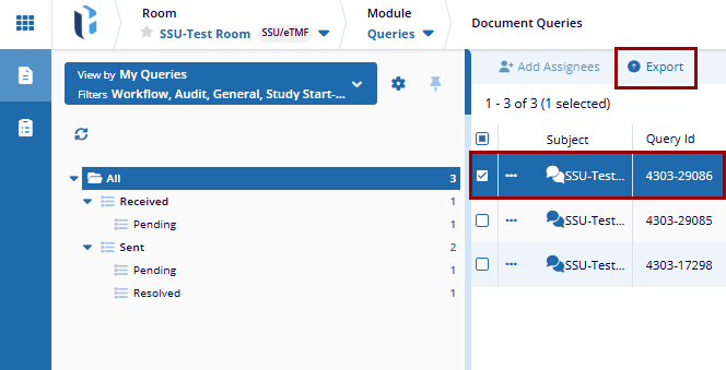 - All queries in the room: Exports all queries in the current room, whether queries are visible in the grid or not. This option is used when the user wants to ensure that all queries within a room are exported.