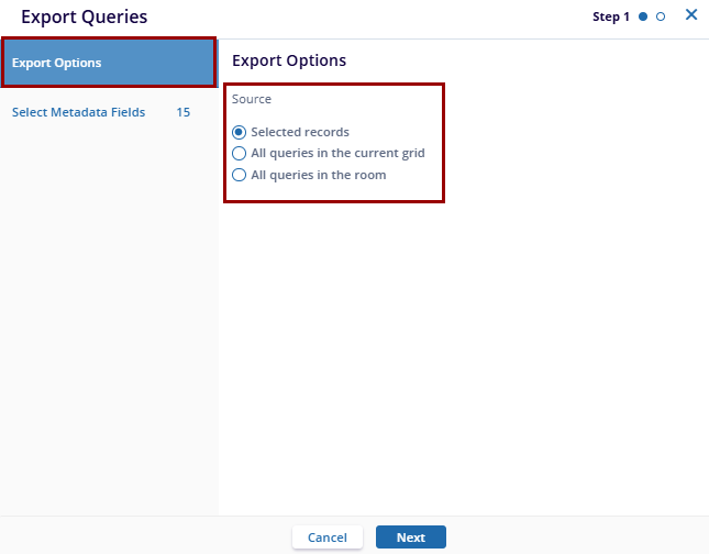 - Selected records: Exports only the queries the user has selected using the checkboxes in the grid view. This is useful when exporting a specific subset of queries.