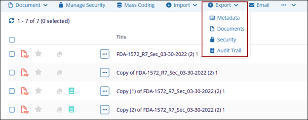 The Export function allows users to export either selected or all documents that are currently present in the grid. Like the Import function, this export can export documents, metadata, or both. Users with sufficient access will be able to export security and audit trial information