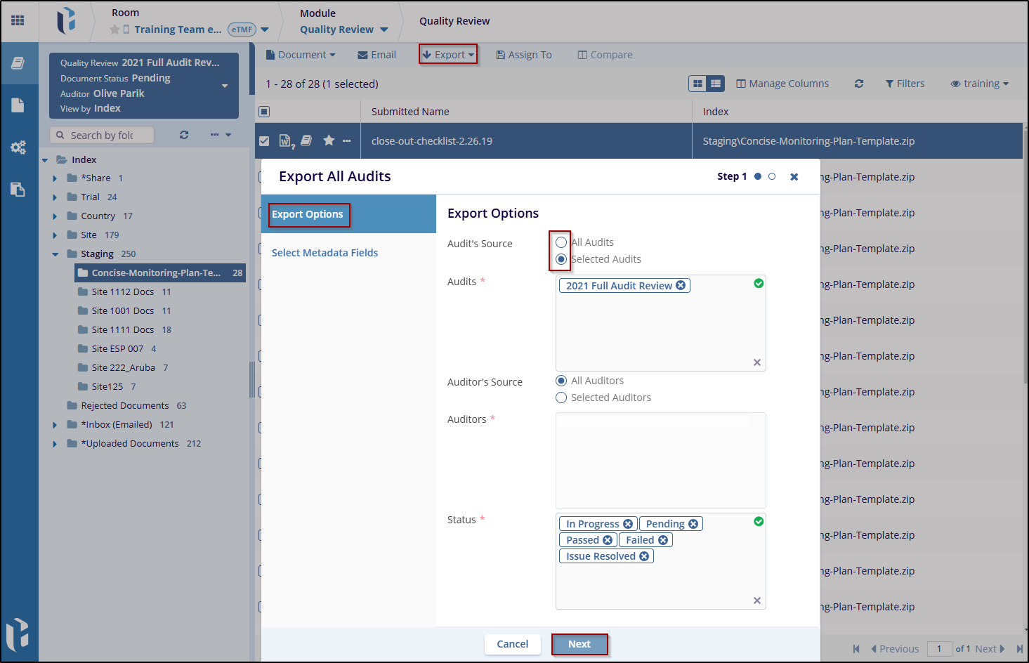 - In the Export Options under Audit’s source, select the radio button as per requirement. For example, All Audits or Selected Audits.