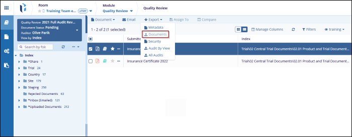 The Export Document allows users to export selected documents in formats like PDF, Excel, or CSV. It works similarly to metadata export see the steps above for more details.