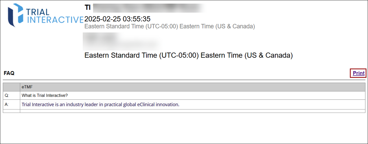 - A new window opens with the list of FAQ and answers with an option to print.
