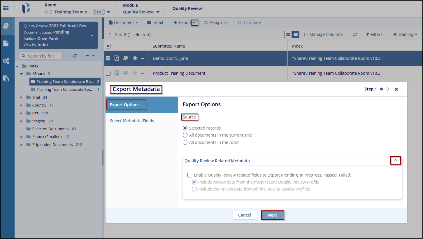 - Enable Quality Review Related Fields to Export: select this checkbox to include fields related to quality review (such as Pending, In Progress, Passed, Failed) in the export.