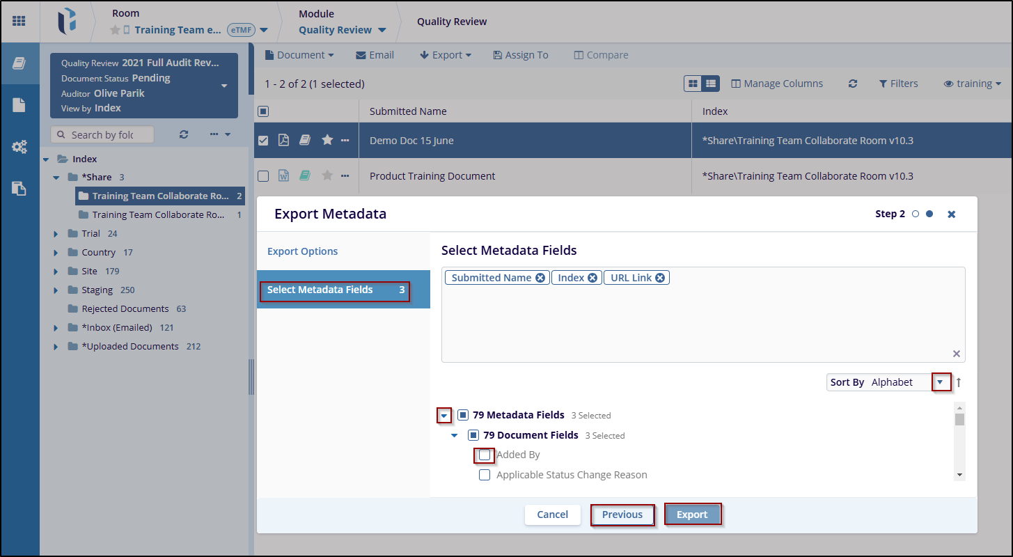 - Once you proceed to the Select Metadata Fields option and select the required metadata fields, the user can sort them by Alphabet or Logic to include in the export.