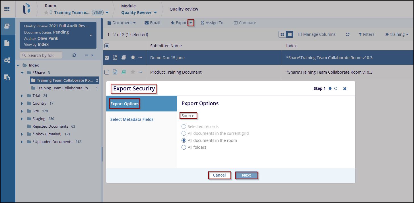 - Click the Export dropdown, and select Export Security. A new Export Security window will open, where the user can see the options, Export Options and Select Metadata Fields. By default, the Export option is selected.