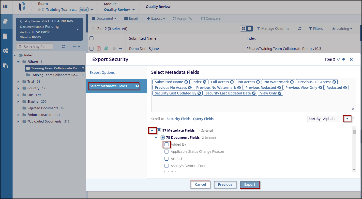 - Check the boxes next to the metadata fields that need to be included in the export.