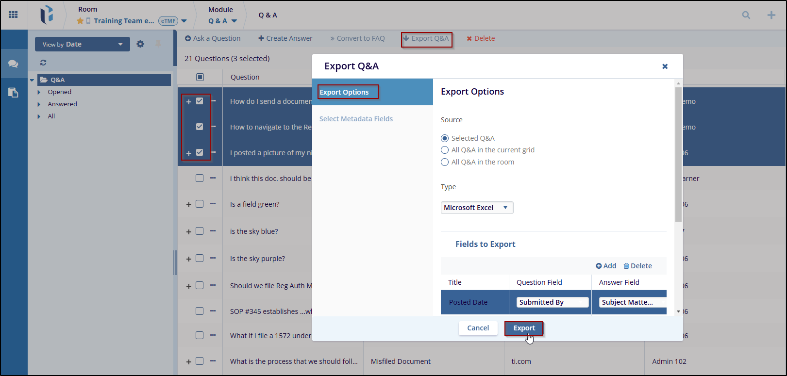 - Click the Export Q&A button from the top menu bar above the index panel.