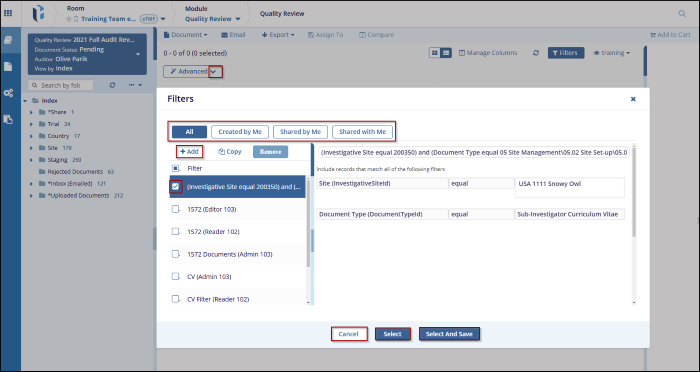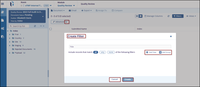- Click the Create button to create a new filter to the current view, If the user decides not to save the changes, click the Cancel button to discard changes.