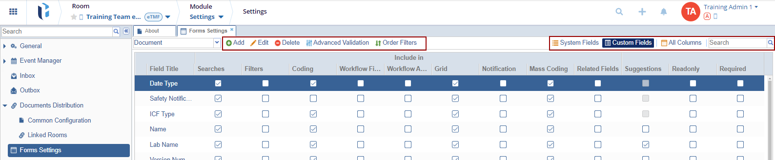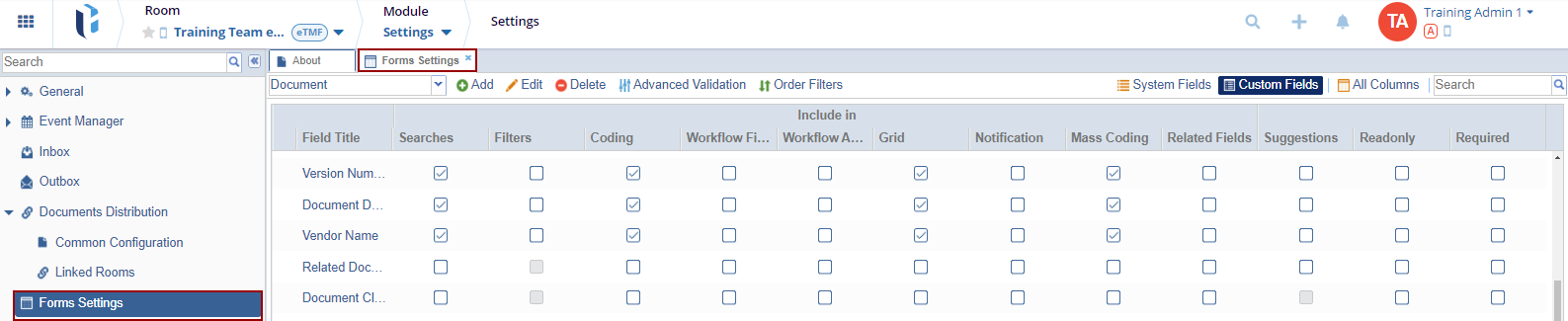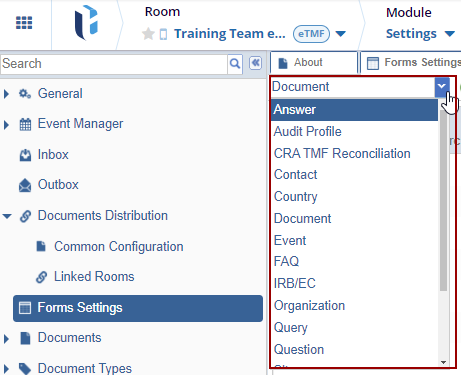 The Form Settings menu manages metadata and form settings across the study room. It allows customization of form fields used throughout the study, including document metadata fields, Question and Answer forms, and audit-related fields.