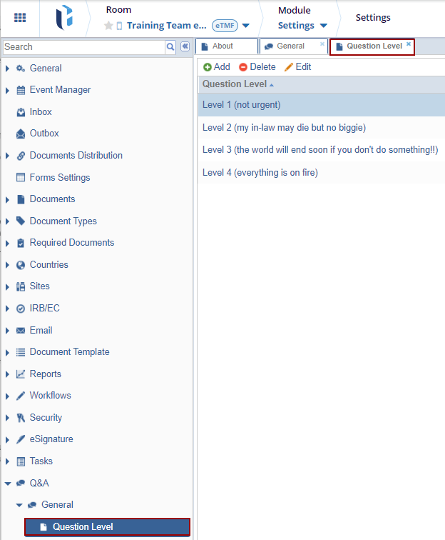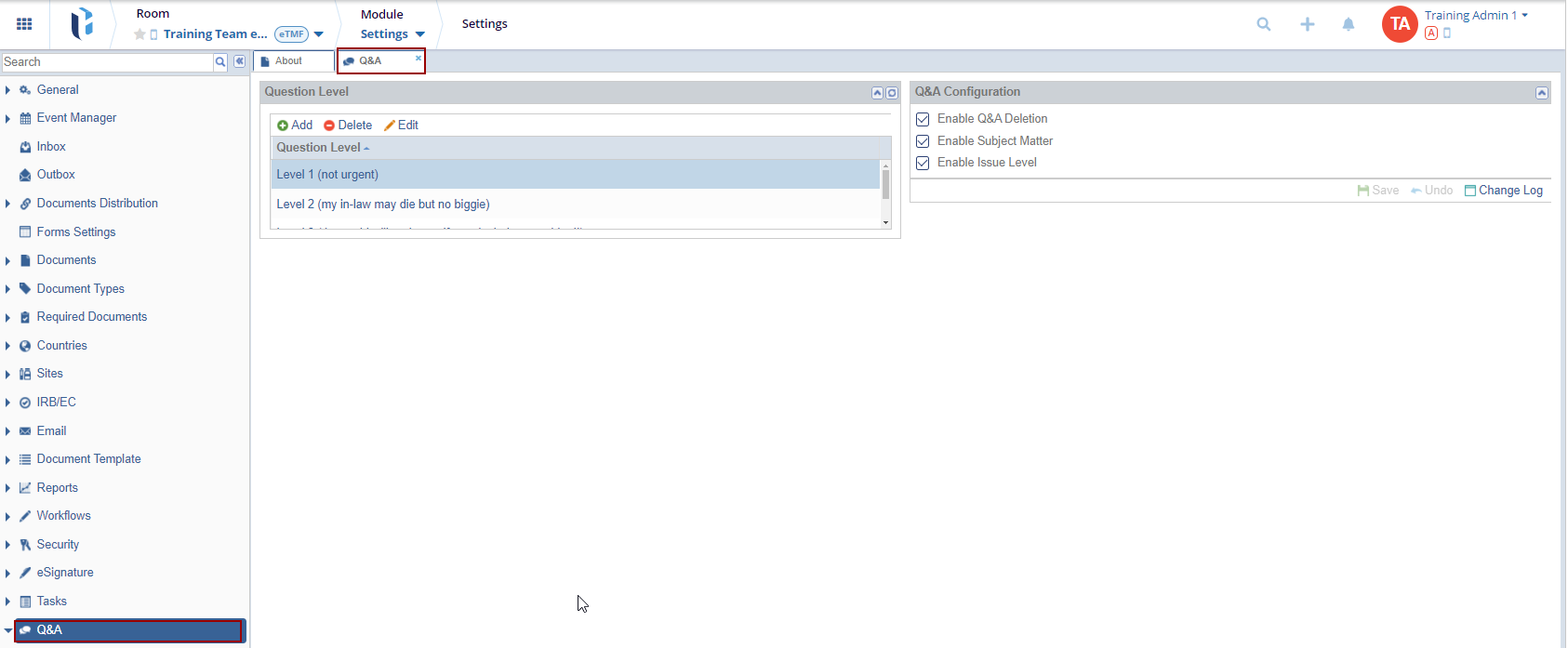 In the Q&A settings view, the user can add, edit, or delete Question Levels. The Q&A configuration panel allows you to enable or disable various options, including the ability to delete questions and answers, activate Subject Matter categories, and enable question issue levels.