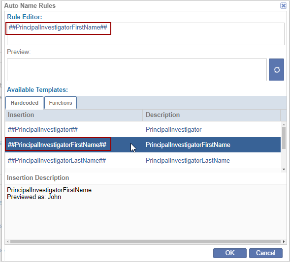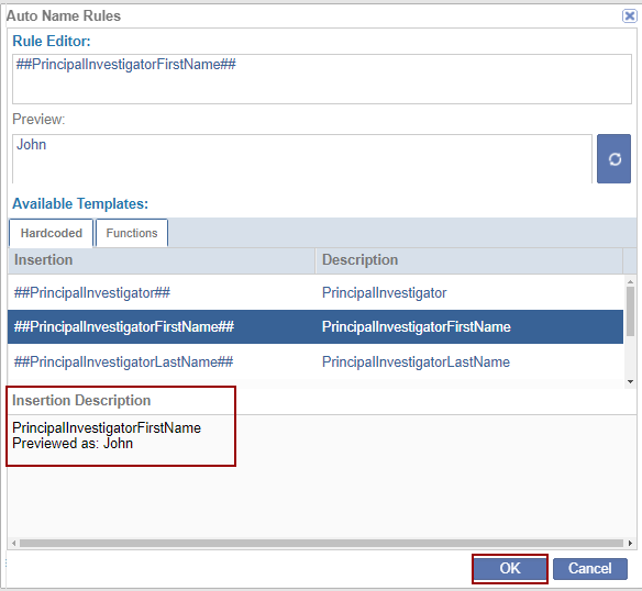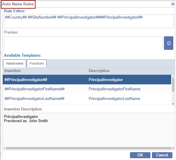 - The ‘Site Naming Pattern’ is built and displayed in the Rule Editor box. The user can also type text into the Rule Editor.