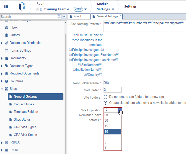 The General Settings for Sites describes the basic information regarding Site name and number, Address and Contact Details, etc. Explains about the Site statuses (e.g., Active, Pending, Closed) and transitions. Tracking essential regulatory documents, approvals, and certifications. Monitoring subject enrollment, site performance, and milestones. Defining user roles and access levels for site-related data and functionality.