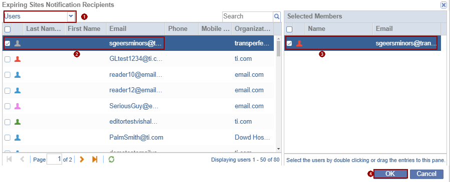 - The Expiring Sites Notification Recipients pop-up window is displayed with the Users/Groups members.