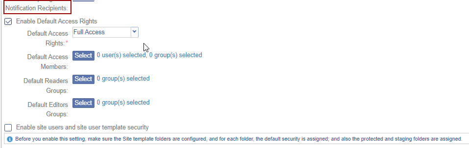 Note: Before you enable this setting, make sure the Site template folders are configured, and for each folder, the default security is assigned; and also the protected and staging folders are assigned.