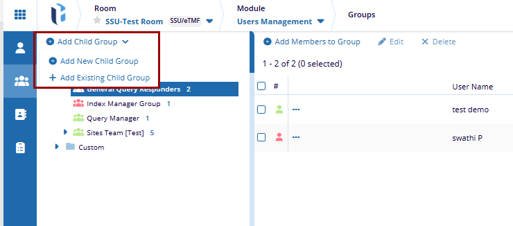 To add existing child group in the User Management module, follow these steps: