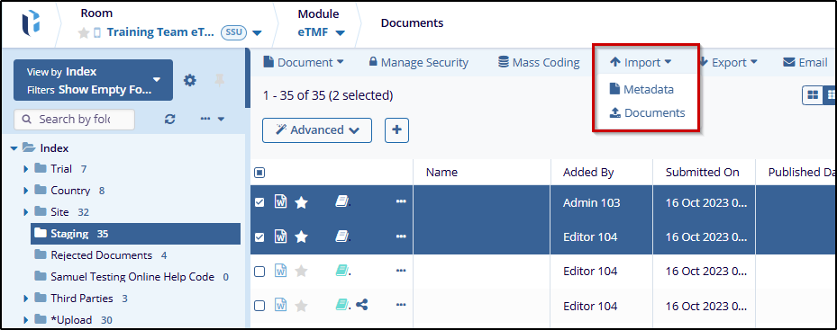 The Import function allows users to bring documents into the room, where permissible, the function also allows for the import of metadata.