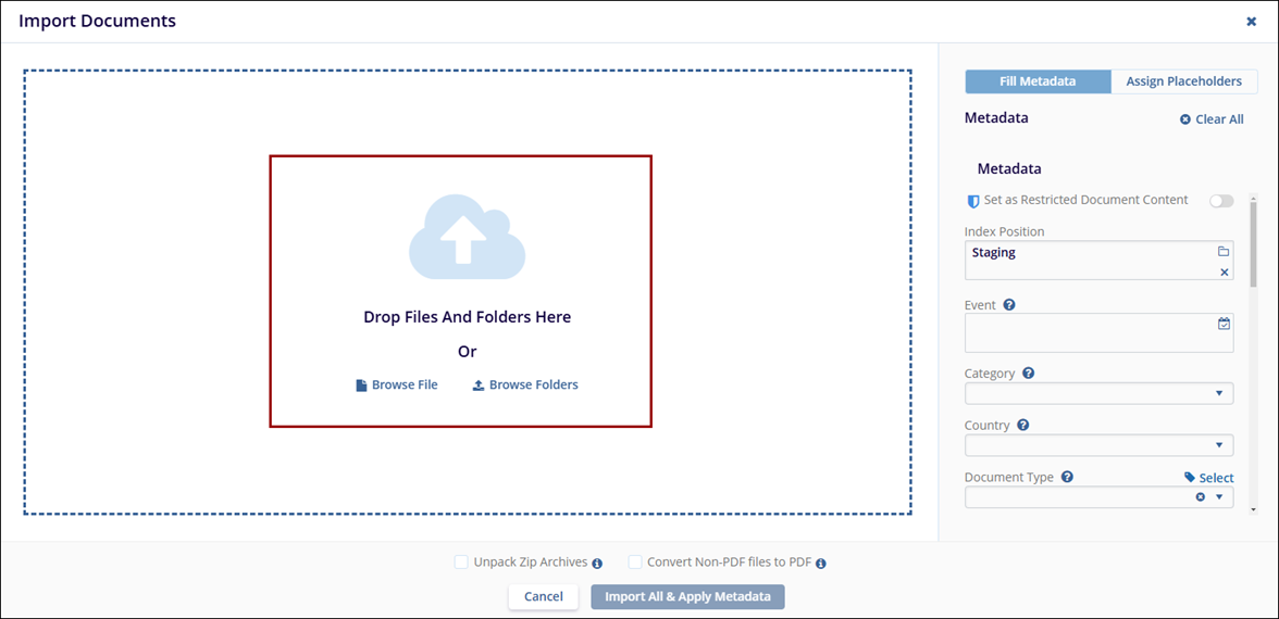 - Unpack Zip Archives: Enable this option if a ZIP folder is uploaded and the documents within the ZIP folder need to be uploaded as separate documents.