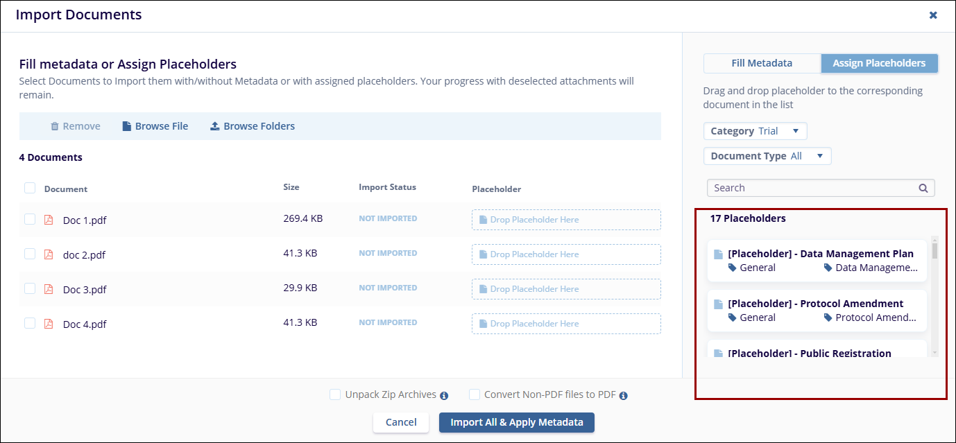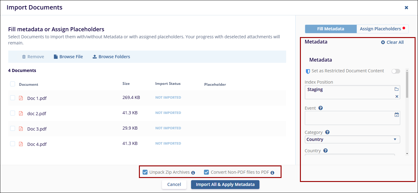 Note: If Category, Country and Document Type are selected within the Fill Metadata tab, the Assign Placeholders tab will display the placeholders by default.