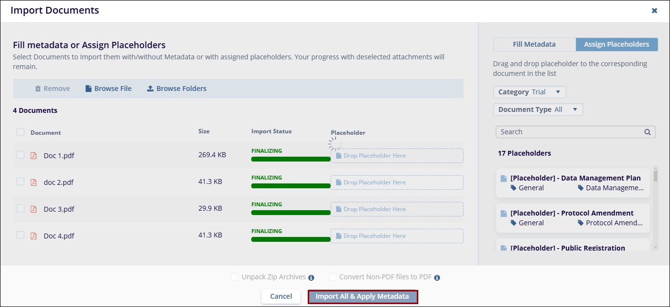 - Click on the Import All & Apply Metadata button once the metadata fields are updated or the placeholders are assigned.