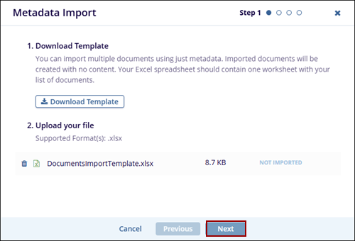 - In the Metadata Import window, click on Download Template to get a pre-formatted file that contains the required metadata fields.