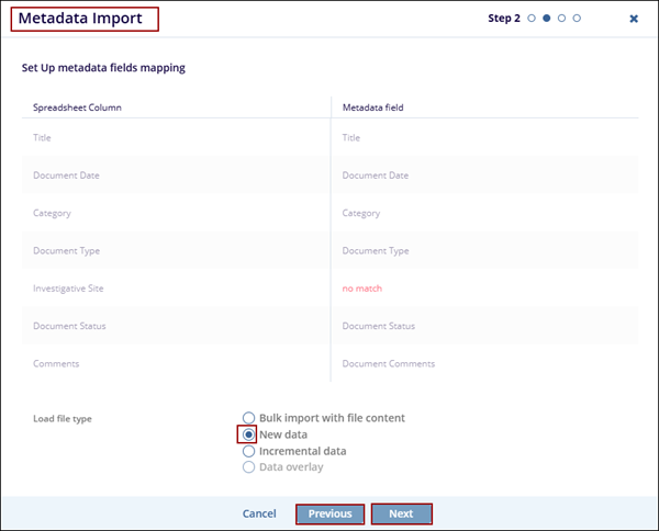 The system displays a Metadata Fields Mapping screen, ensuring that each column from the uploaded file is correctly mapped to the system's metadata fields.