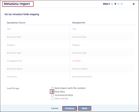 - The system displays a Metadata Fields Mapping screen, ensuring that each column from the uploaded file is correctly mapped to the systems metadata fields.