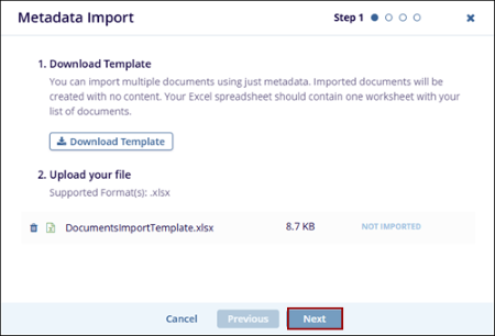 - In the Metadata Imports window, click on Download Template to get a pre-formatted file that contains the required metadata fields.