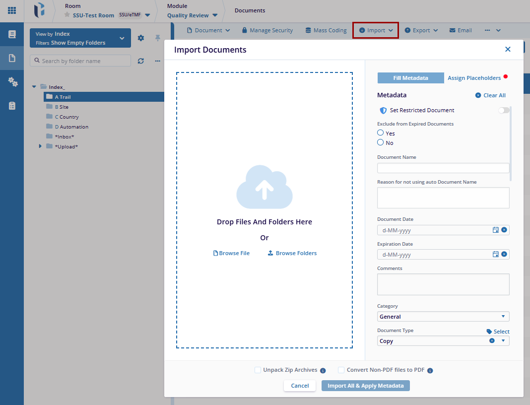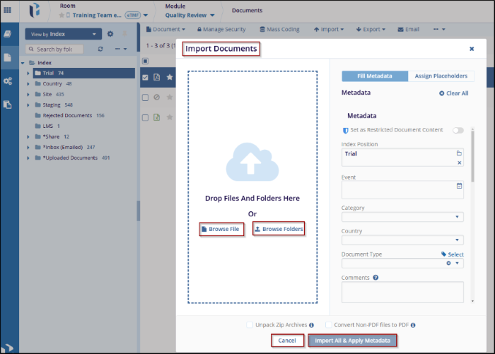 - On the right side of the Import Document window, fill in the required metadata fields.