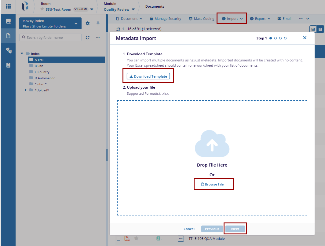 - In the Document Imports window, click on Download Template to get a pre-formatted file that contains the required metadata fields.