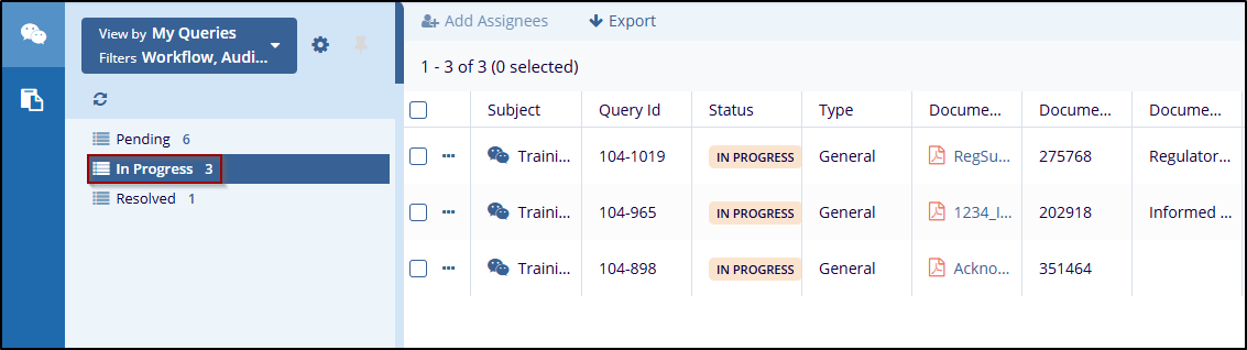 In Progress includes queries that are actively being worked on. Actions or responses are in progress, but the query has not been completely resolved.