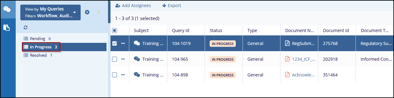 In Progress includes queries that are actively being worked on. Actions or responses are in progress, but the query has not been completely resolved.