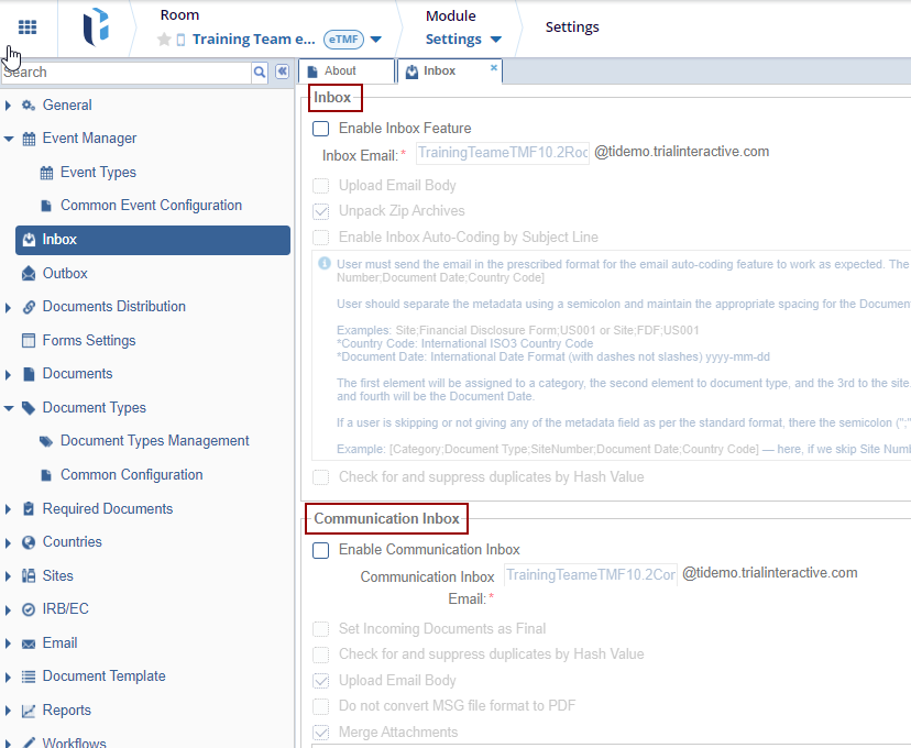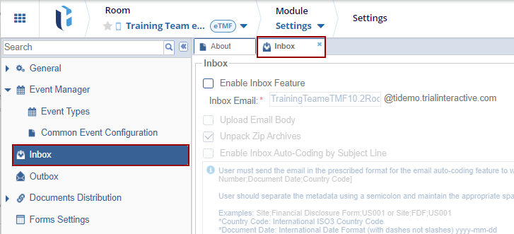 The Inbox in the Event Manager handles incoming emails related to clinical trial documents or communications. It automatically processes and categorizes emails by extracting metadata from the subject line, enabling efficient handling of tasks such as document uploads and communication management. This automated system ensures accurate metadata assignment, minimizing manual input and streamlining workflow efficiency.