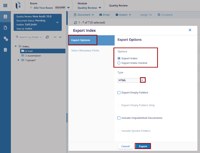 - Select the Export Index from the Index dropdown to open a new window with available options Export Options and Select Metadata Fields.