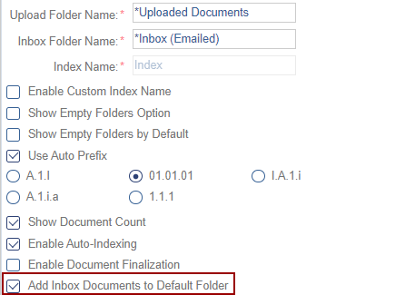 Documents that are emailed into the room’s inbox are usually stored in each user’s Inbox folder, but this can be altered by choosing to enable the ‘Add inbox documents to default folder’ option which would then route all documents emailed to the room inbox directly to the default folder (Staging).