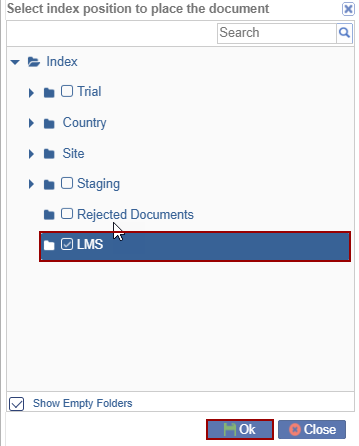 - To add a Rejected documents folder, click on the Search Icon the ‘Select index position to place the document’ pop-up window is displayed.