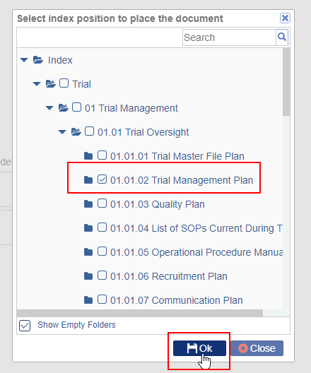 - To add a document to the index folder, click on the Search Icon the ‘Select index position to place the document’ pop-up window is displayed.