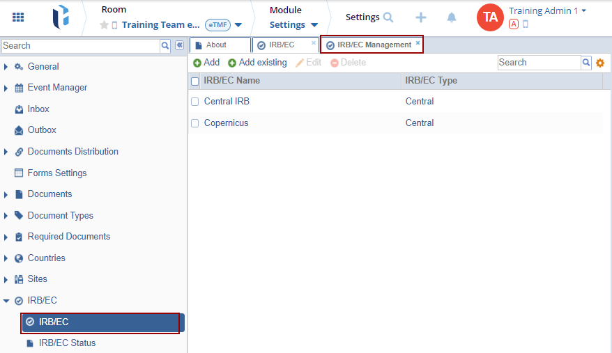 - Locate the IRB/EC Name and click the Delete button, the selected IRB/EC gets deleted.