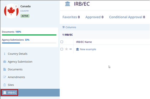 The IRB/EC tab in the Country module lists all IRBs/ECs associated with a specific country. Users can edit, manage columns, search, manage, and create filters on this page. The grid pane displays key details, including IRB/EC Name, Status, Progress, and Address. Refer to the screenshot below for reference.