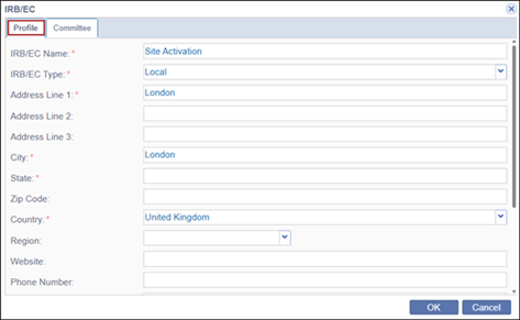 - On the IRB/EC window, make the changes to the Profile and Committee tabs
