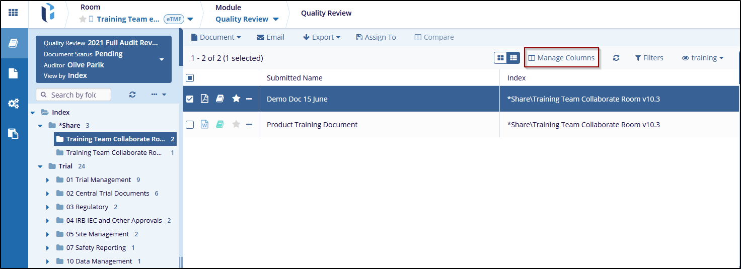 The Manage Columns allows users to customize the columns that appear in a data table. It provides the option to select, organize, and adjust the columns to display specific data as required.