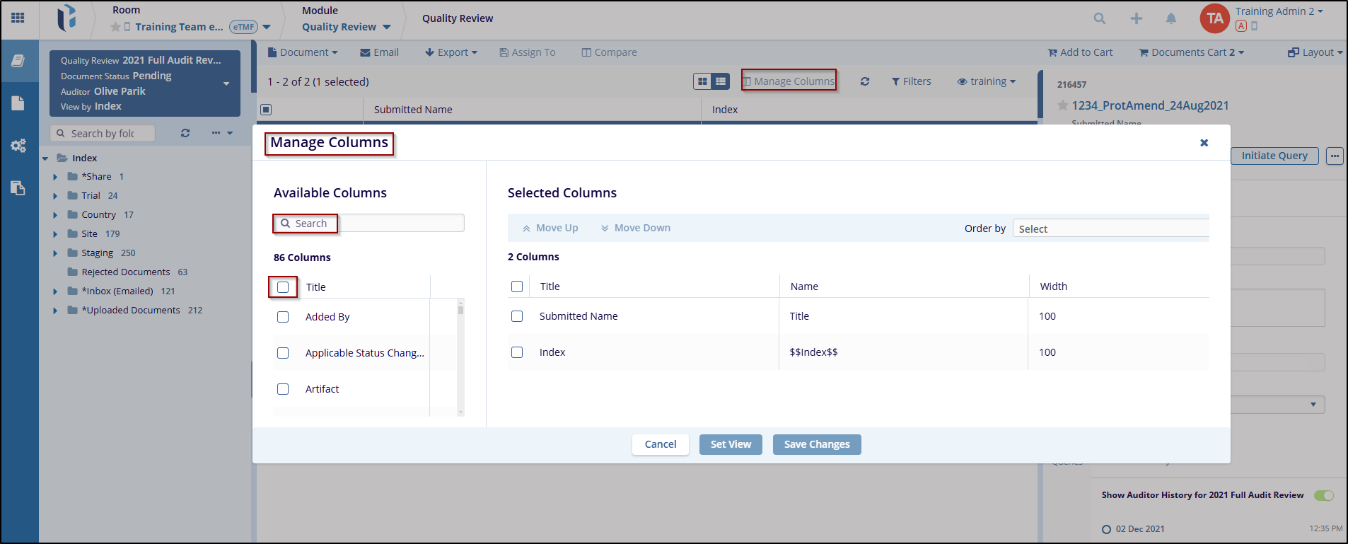 - In the Selected Columns section, the user can use the Move Up and Move Down buttons to reorder the columns in the selected list. For each selected column, the user can see its Title, Name, and Width.